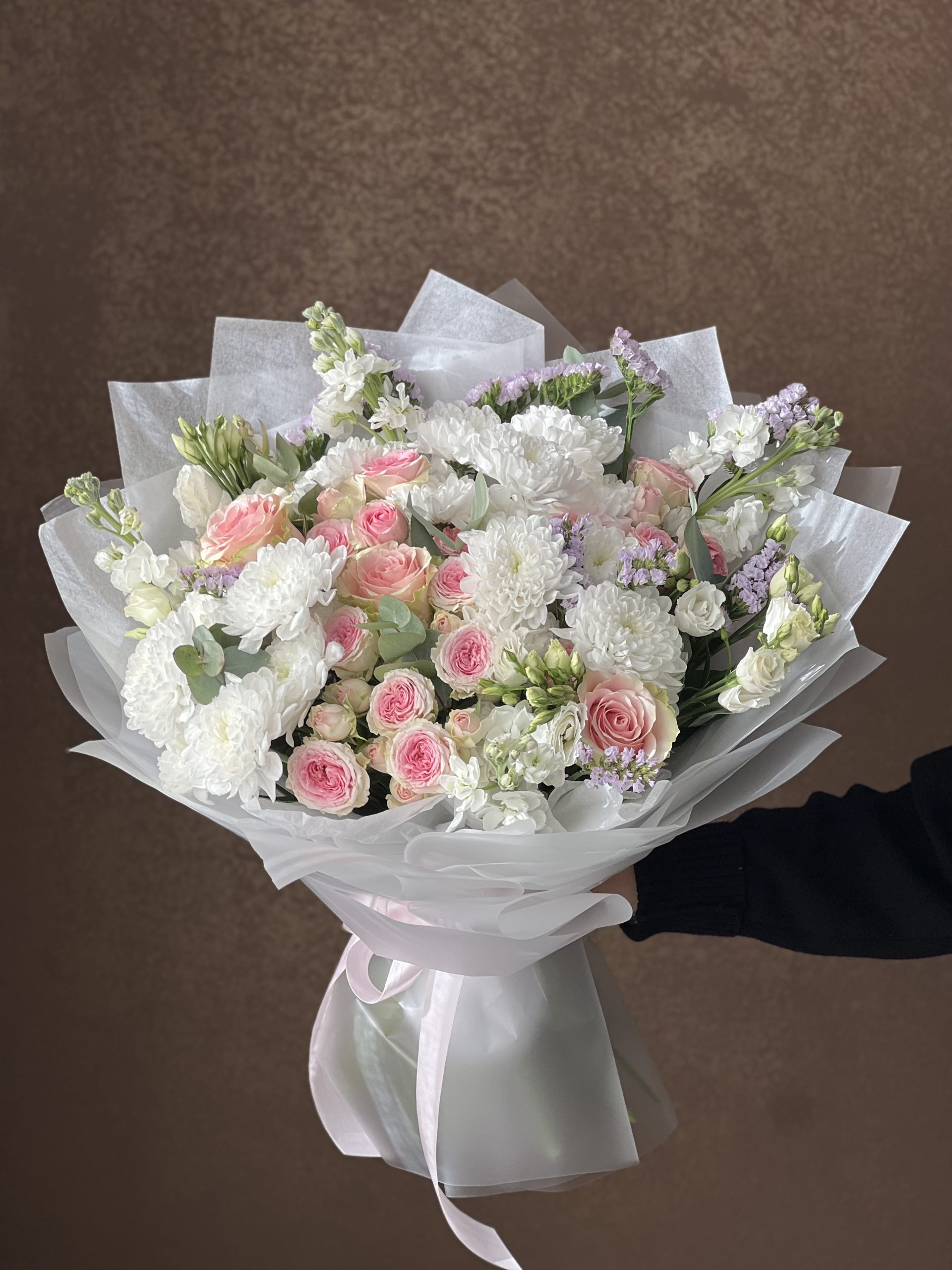 Букет “Аура”. Состав: хризантема кустовая, эустома, маттиола, кустовая роза, статица, зелень, подарочная упаковка, атласная лента. Цвет упаковки может быть подобран на вкус покупателя. Наличие уточняйте у менеджера. Производство РБ.
