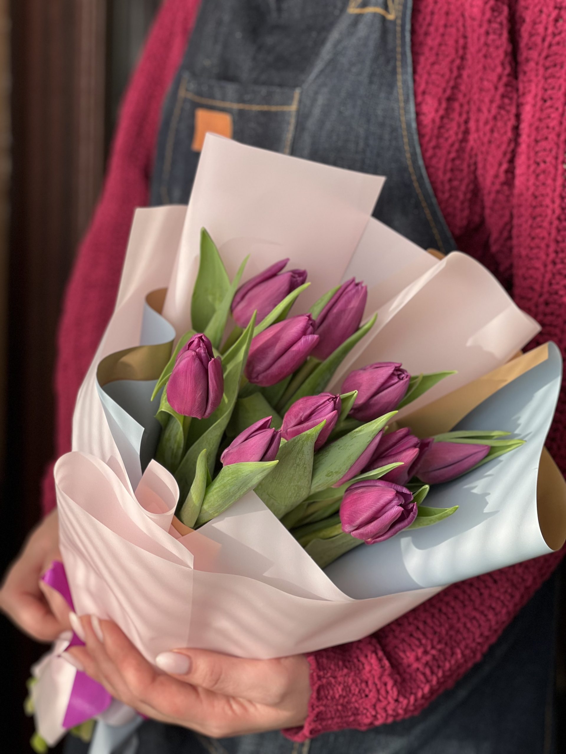 Букет из 11 Тюльпанов в нарядной упаковке. Cостав: тюльпаны, декоративная упаковка.Цветовая гамма может быть изменена по желанию заказчика.Наличие уточняйте у менеджера.Производство РБ.Сезонный товар.