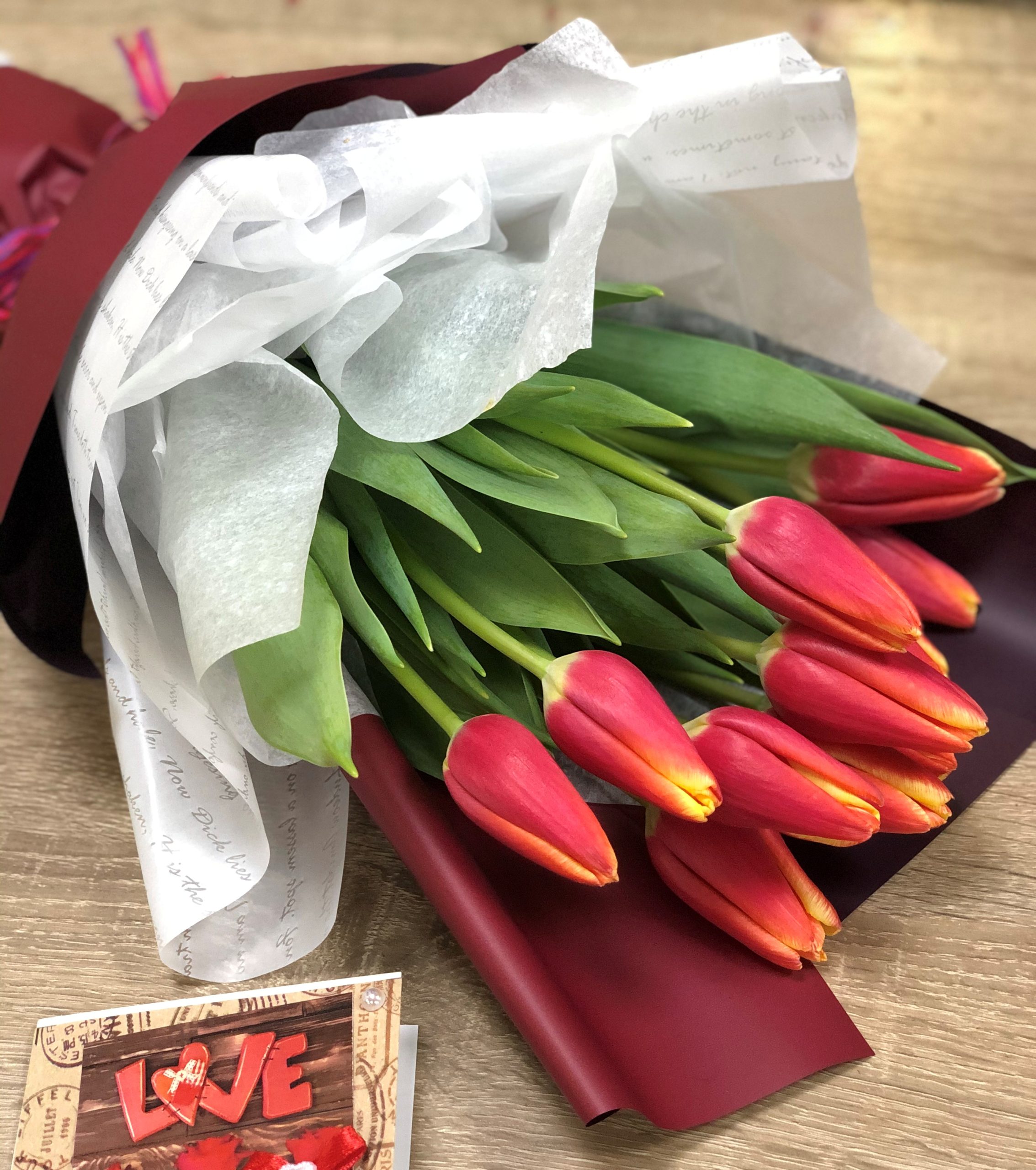Букет из 11 Тюльпанов в нарядной упаковке. Cостав: тюльпаны, декоративная упаковка.Цветовая гамма может быть изменена по желанию заказчика.Наличие уточняйте у менеджера.Производство РБ.Сезонный товар.