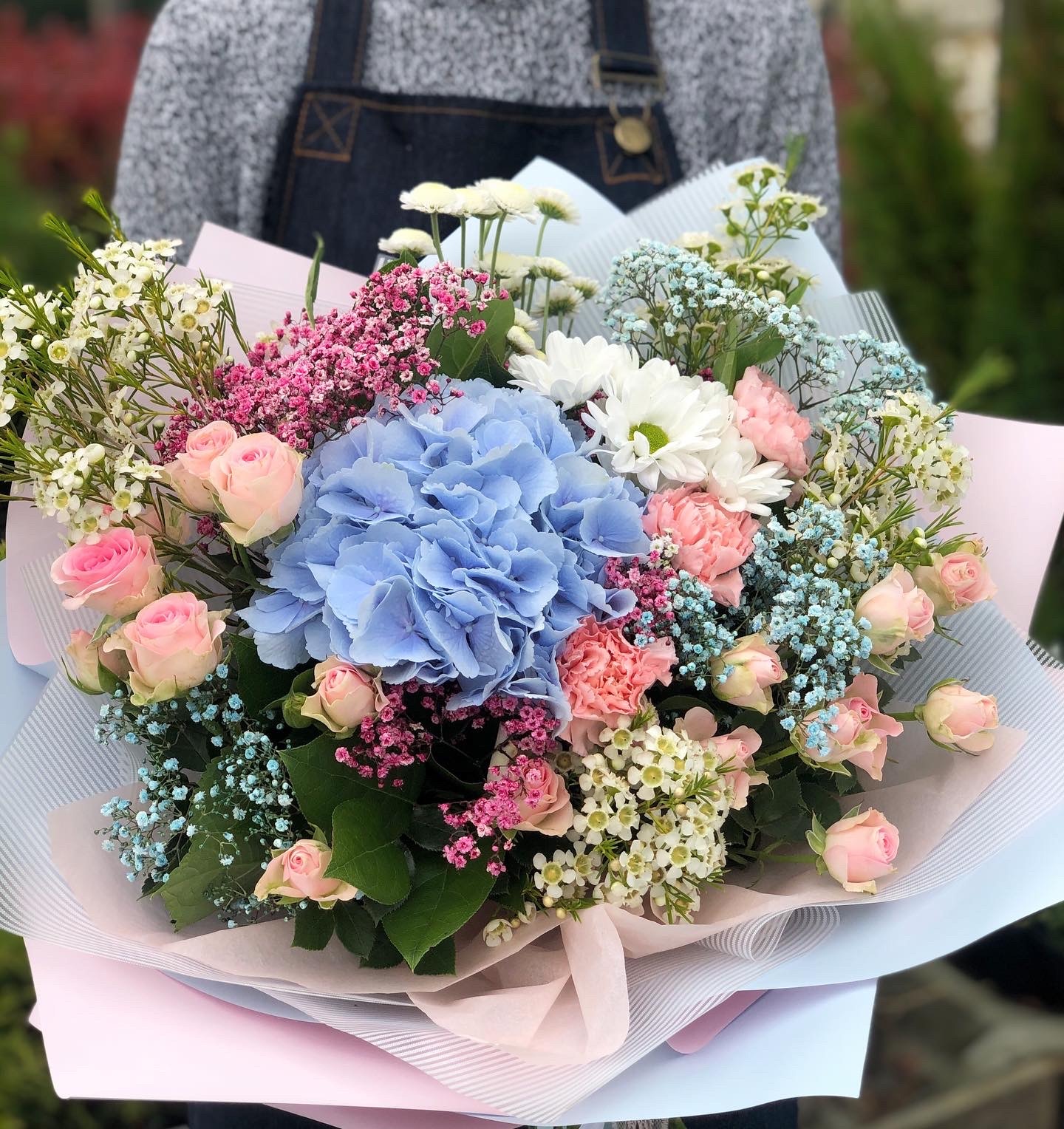 Букет подарочный “Первая любовь”. Состав: гортензия 1шт., гвоздика одноголовая 3шт., кустовая роза 3шт., хризантема кустовая 2шт., хамелациум 1шт.,гипсофила 2шт., зелень, подарочная упаковка, атласная лента. Цветовая гамма может быть изменена по желанию заказчика. Наличие уточняйте у менеджера. Производство РБ.