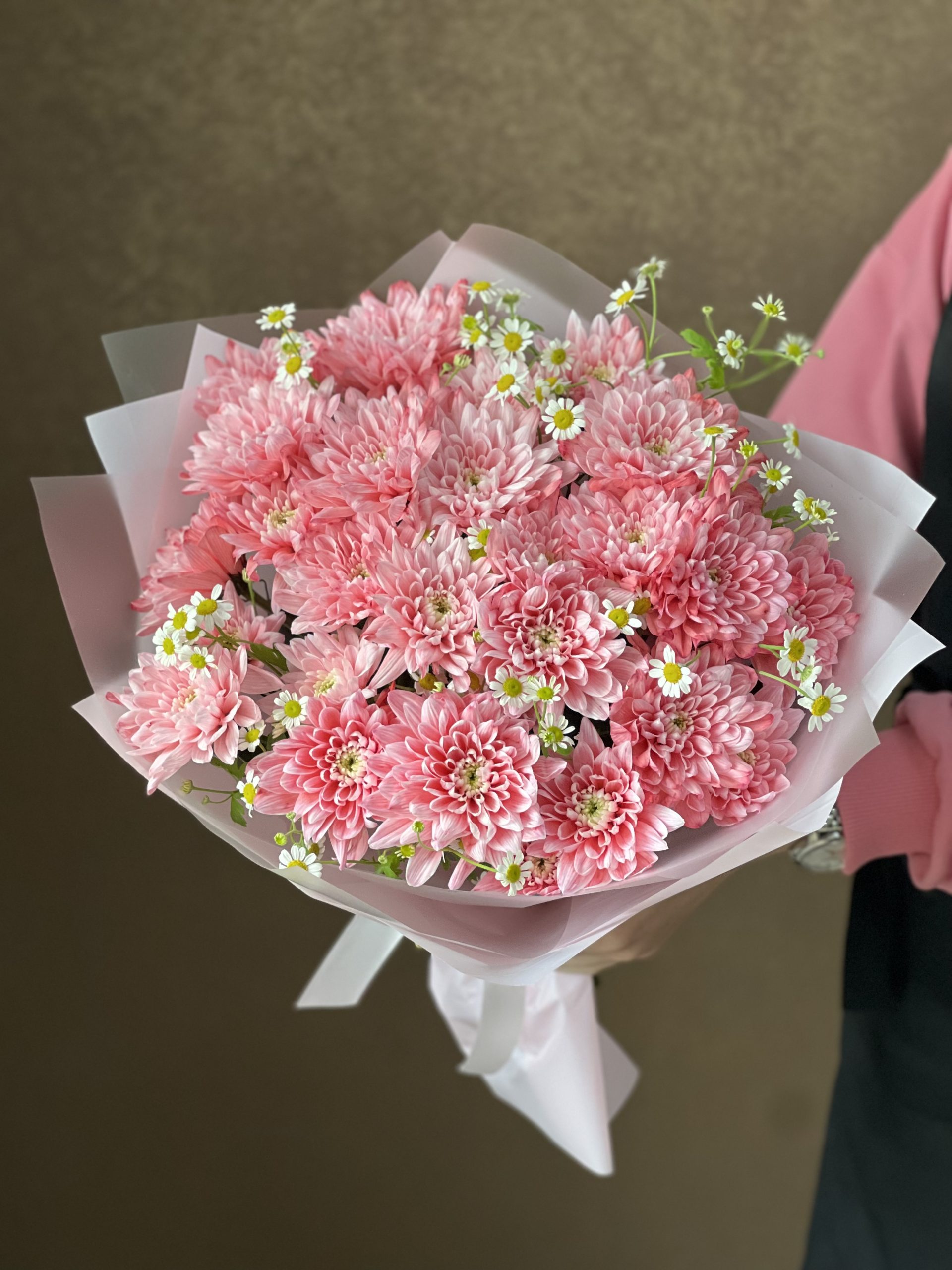 Букет “Декор”.Состав: хризантема кустовая 7шт., танацетум 3шт., подарочная упаковка, атласная лента. Цвет роз может быть подобран на вкус покупателя. Наличие уточняйте у менеджера. Производство РБ.