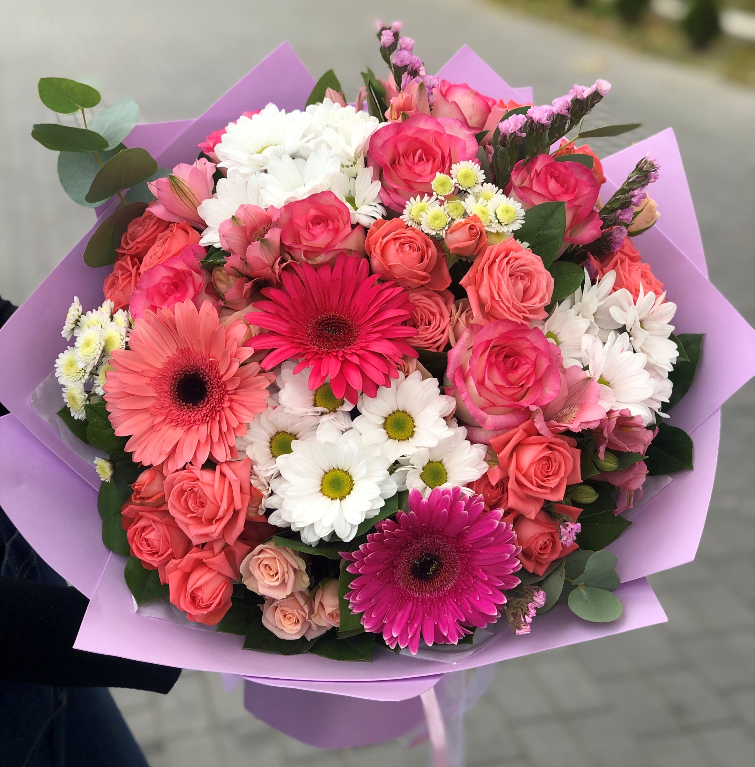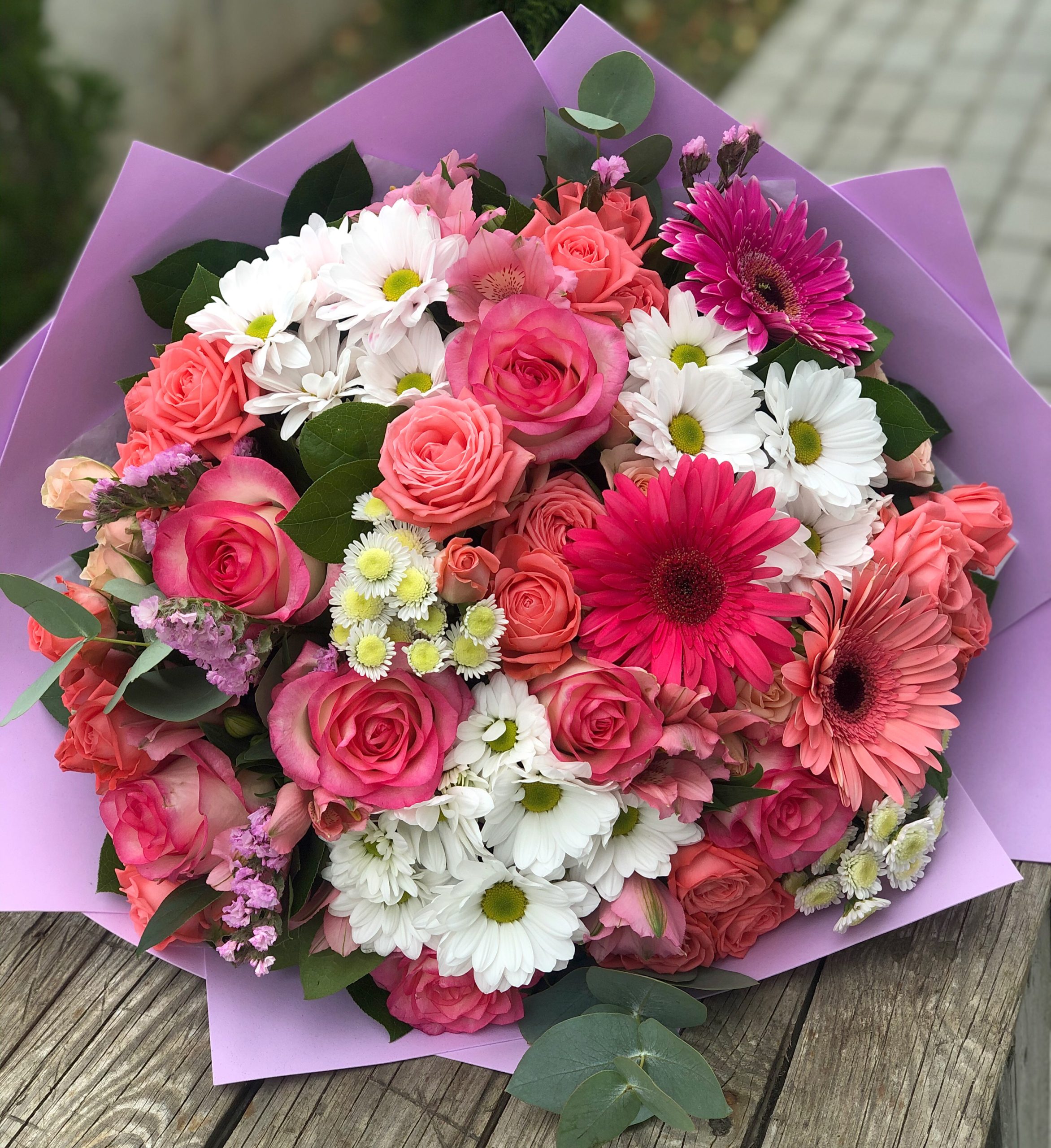 Букет “Моей любимой”. Состав: Гербера 3шт., одноголовая роза 7шт., кустовая роза 9шт, хризантема кустовая 5шт, альстромерия 6шт., статица 1шт, зелень, подарочная упаковка, атласная лента. Цветовая гамма может быть изменена по желанию заказчика. Наличие уточняйте у менеджера. Производство РБ.