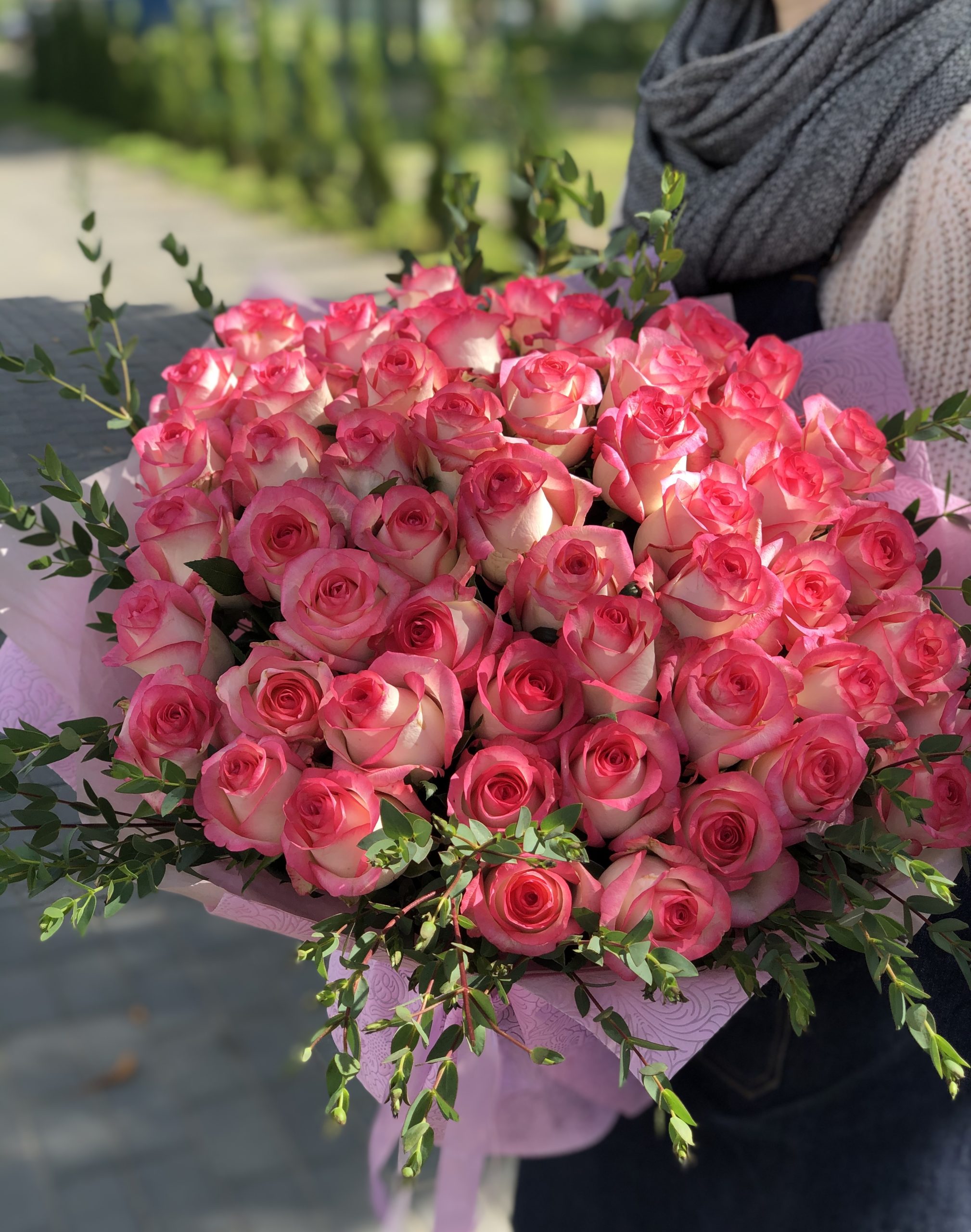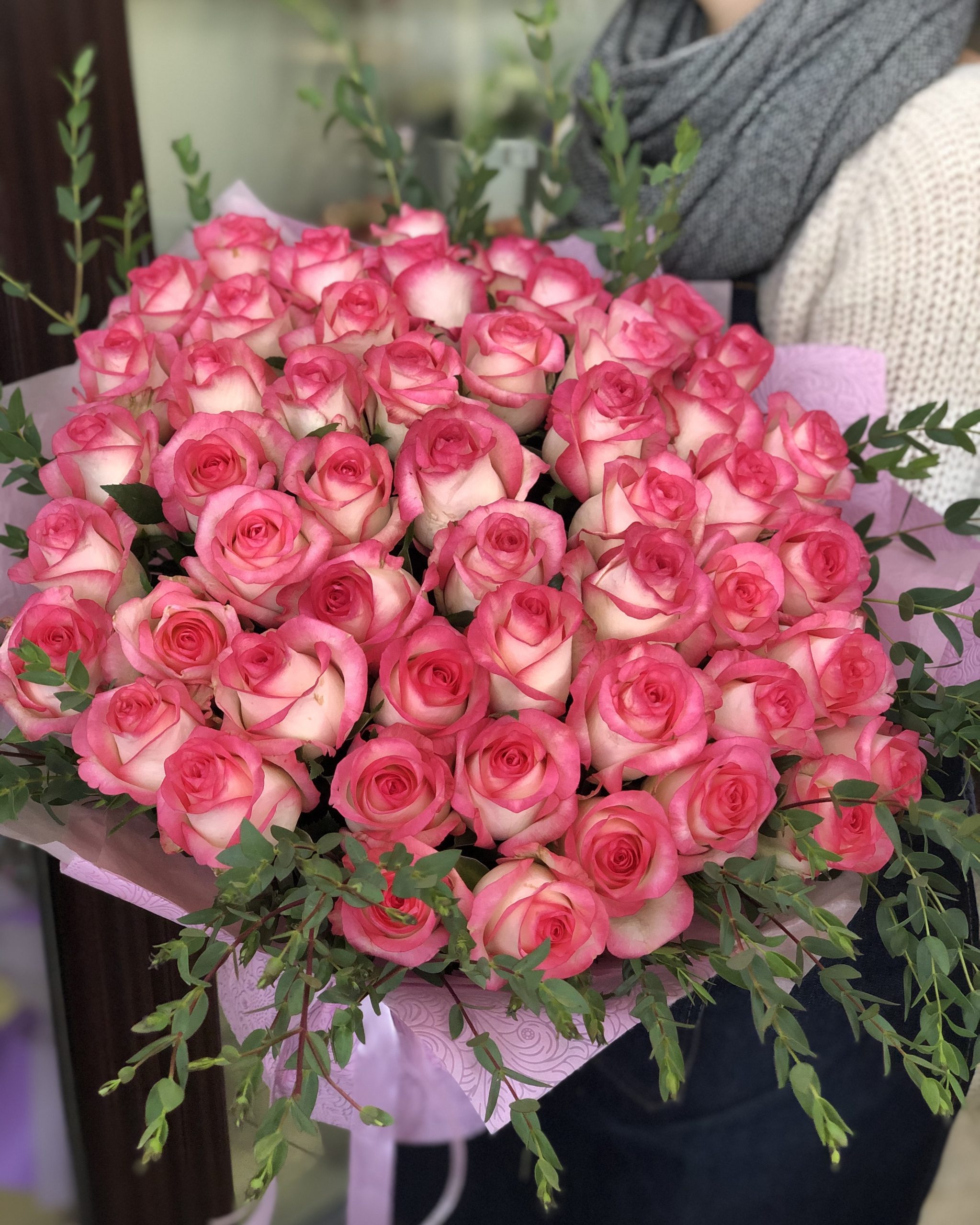 Букет подарочный “Юбилей”. Состав: роза одноголовая 50-60см 51шт., эвкалипт, подарочная упаковка, атласная лента. Цветовая гамма может быть изменена по желанию заказчика. Наличие уточняйте у менеджера. Производство РБ.