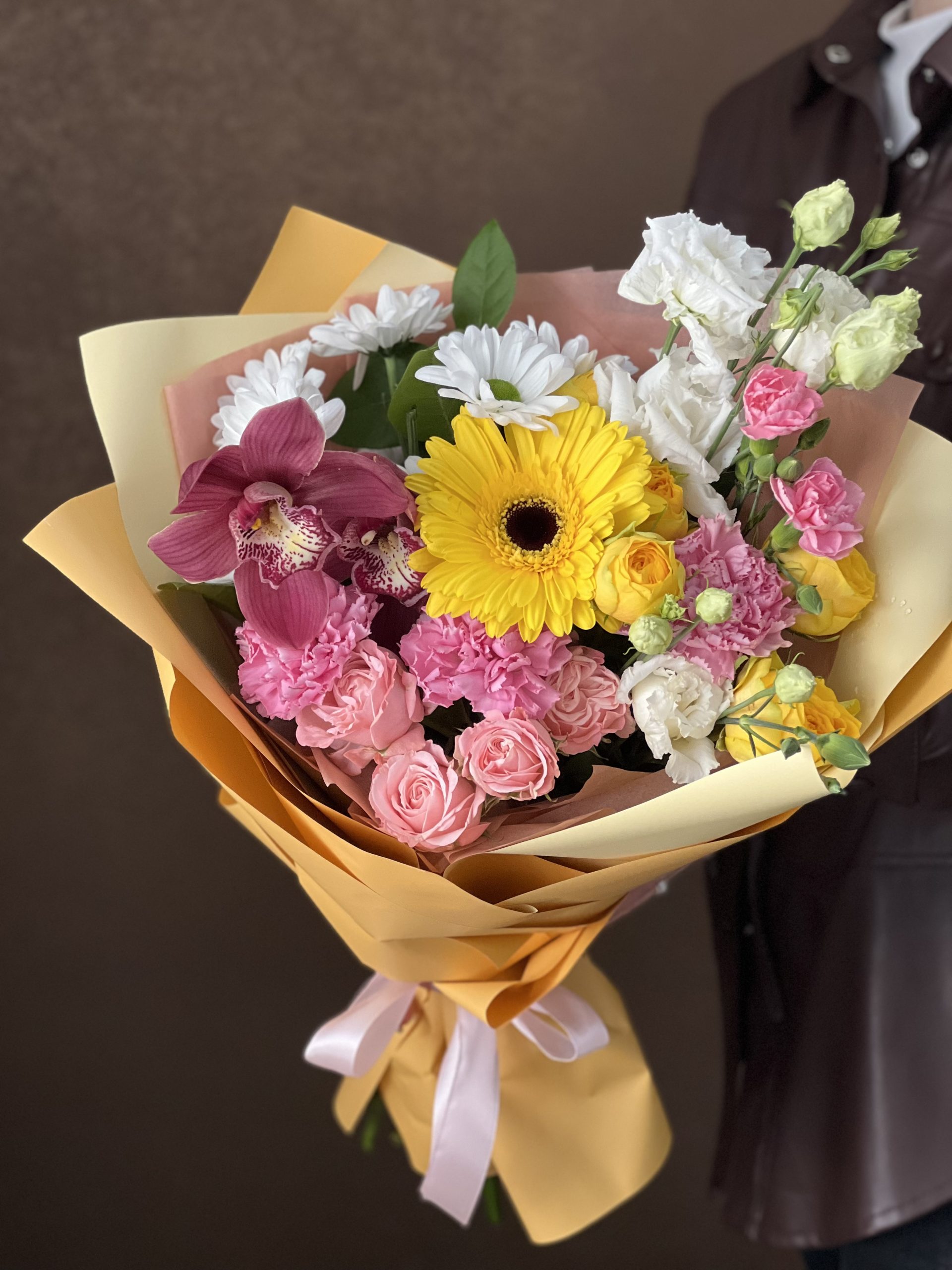 Букет подарочный “Позитивчик”. Состав: гербера, орхидея цимбидиум, кустовая хризантема, кустовая роза, эустома, гвоздика одноголовая, гвоздмка шабо, зелень, атласная лента, декоративная упаковка. Цветовая гамма может быть изменена по желанию заказчика.Наличие уточняйте у менеджера. Производство РБ.