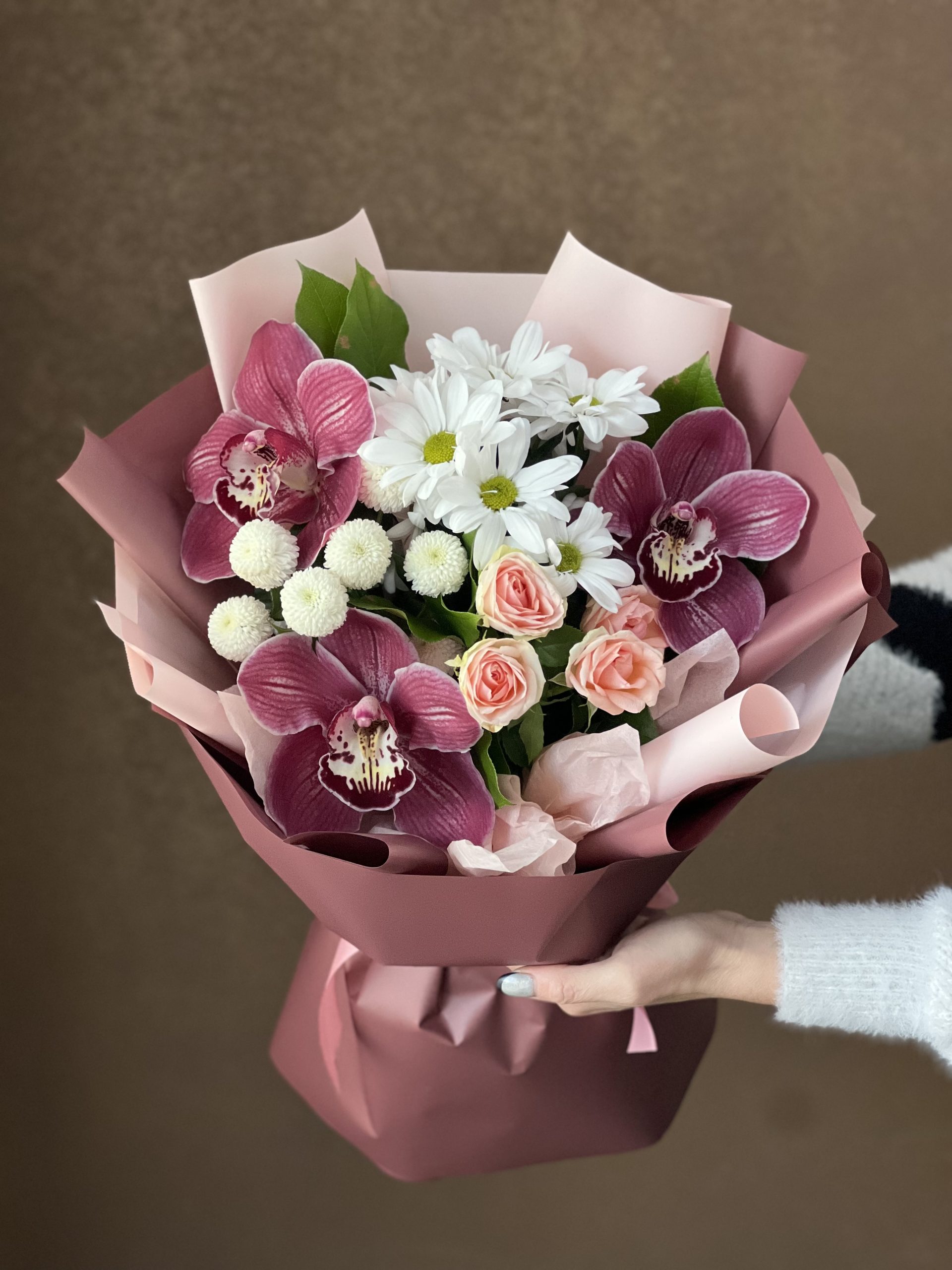 Букет “Щербет”. Состав: орхидея цимбидиум, роза кустовая, хризантема кустовая, зелень, подарочная упаковка, атласная лента. Цвет упаковки может быть подобран на вкус покупателя. Наличие уточняйте у менеджера. Производство РБ.