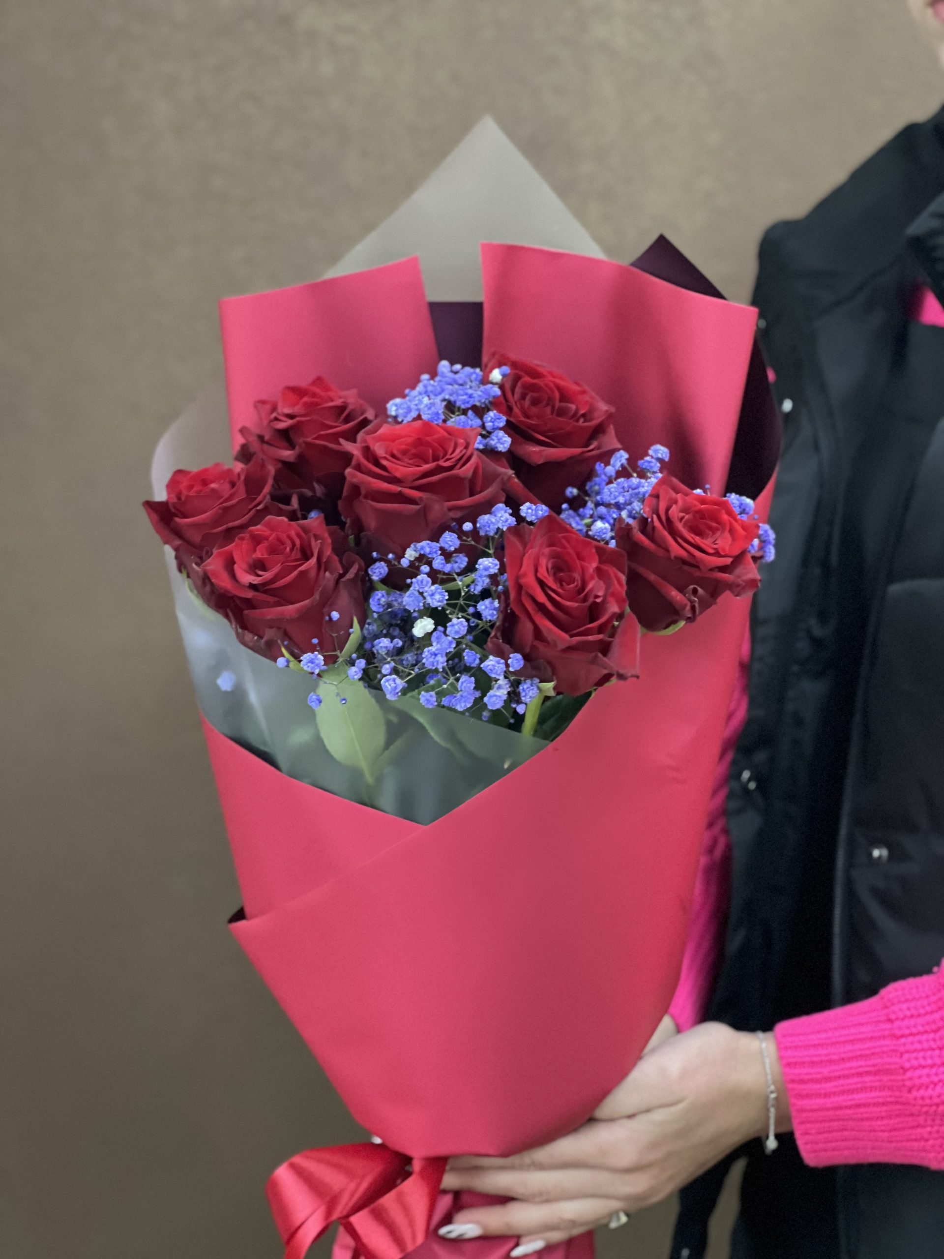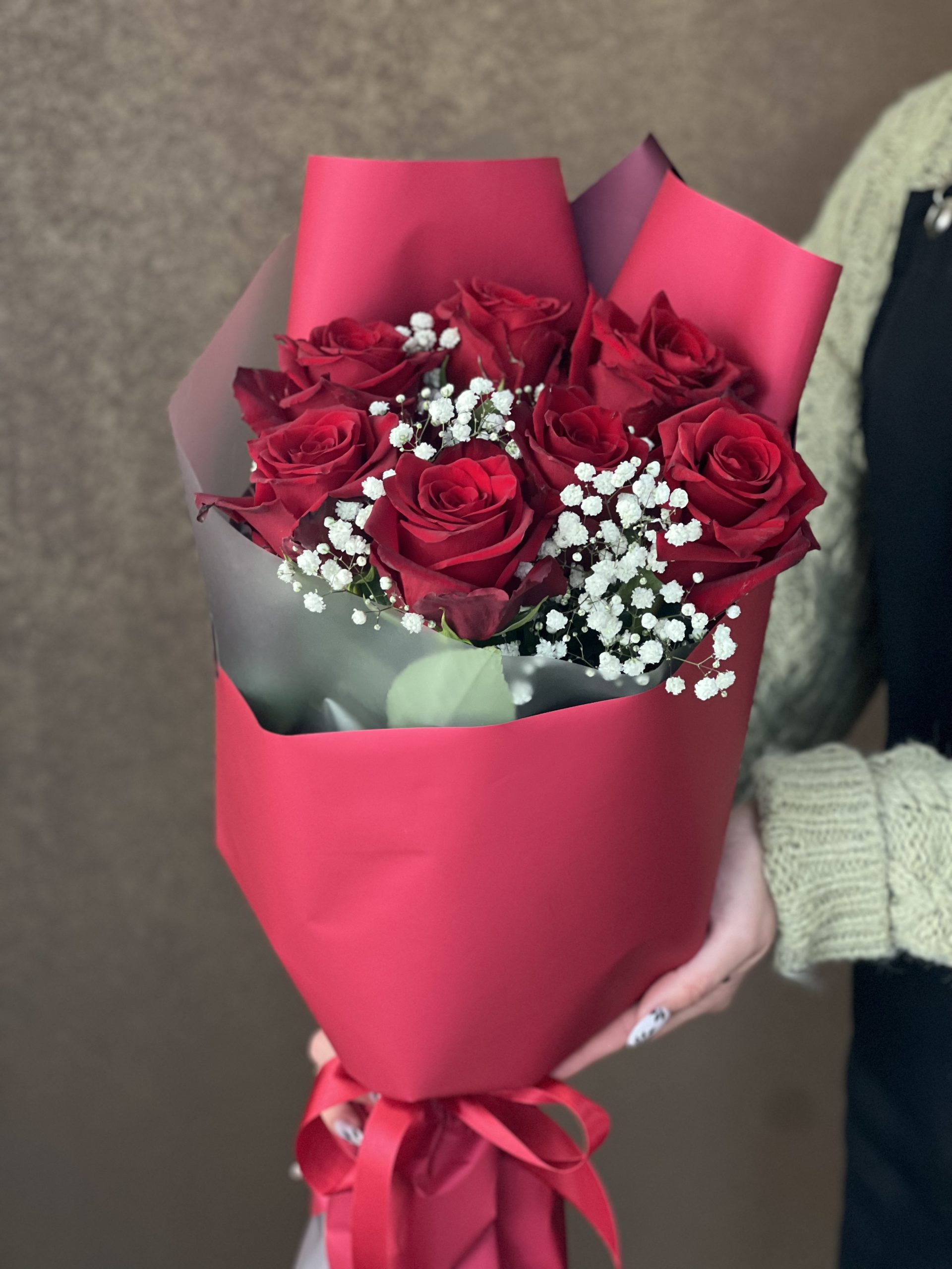 Букет “Страстный поцелуй”.Состав: Роза одноголовая 7шт., гипсофила 1шт, подарочная упаковка, атласная лента. Цвет роз может быть подобран на вкус покупателя. Наличие уточняйте у менеджера. Производство РБ.