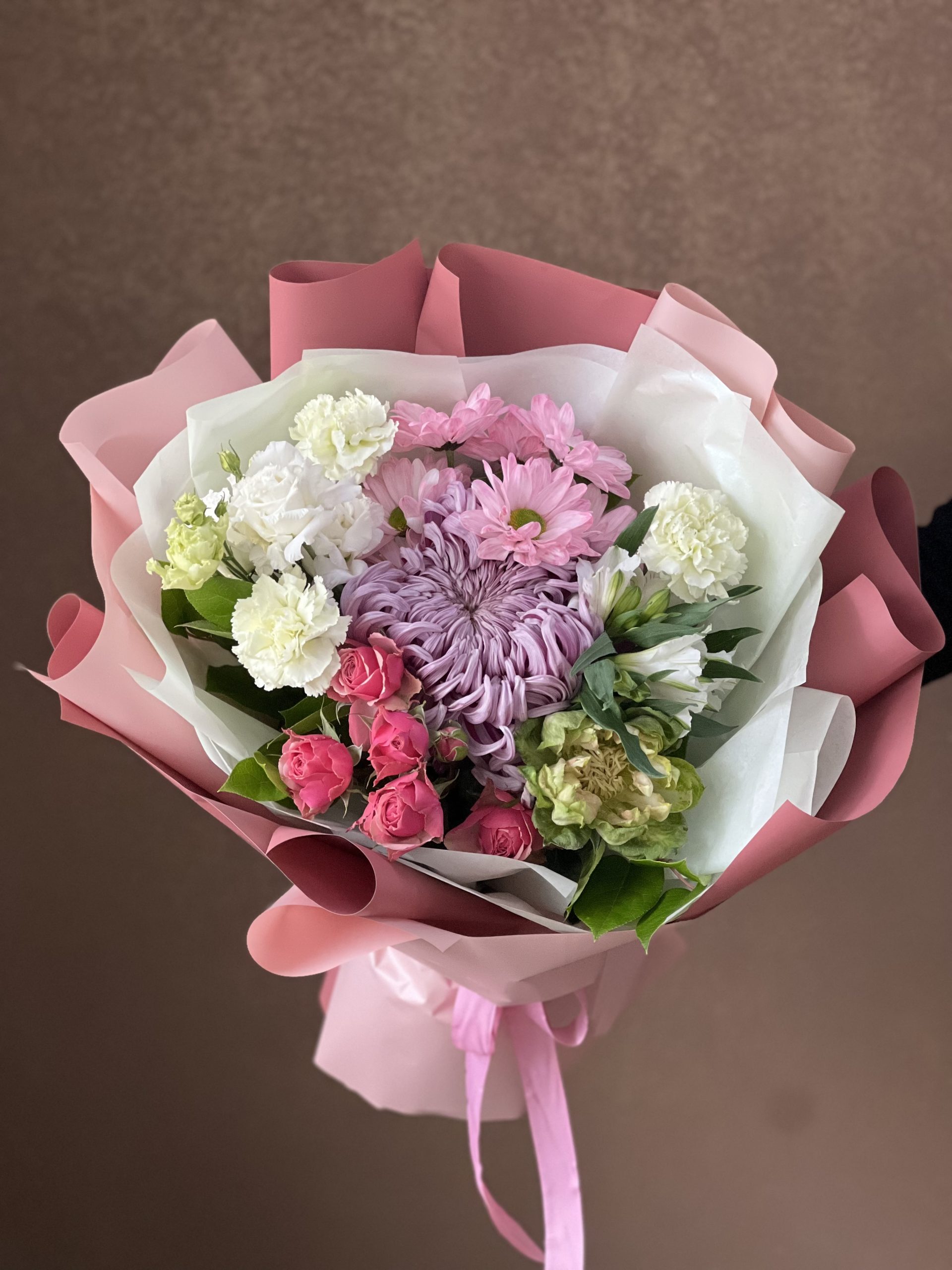 Букет “Виенна”. Состав: хризантема одноголовая, хризантема кустовая, роза одноголовая, роза кустовая, гвоздика одноголовая, эустома, зелень, подарочная упаковка, атласная лента. Цвет упаковки может быть подобран на вкус покупателя. Наличие уточняйте у менеджера. Производство РБ.