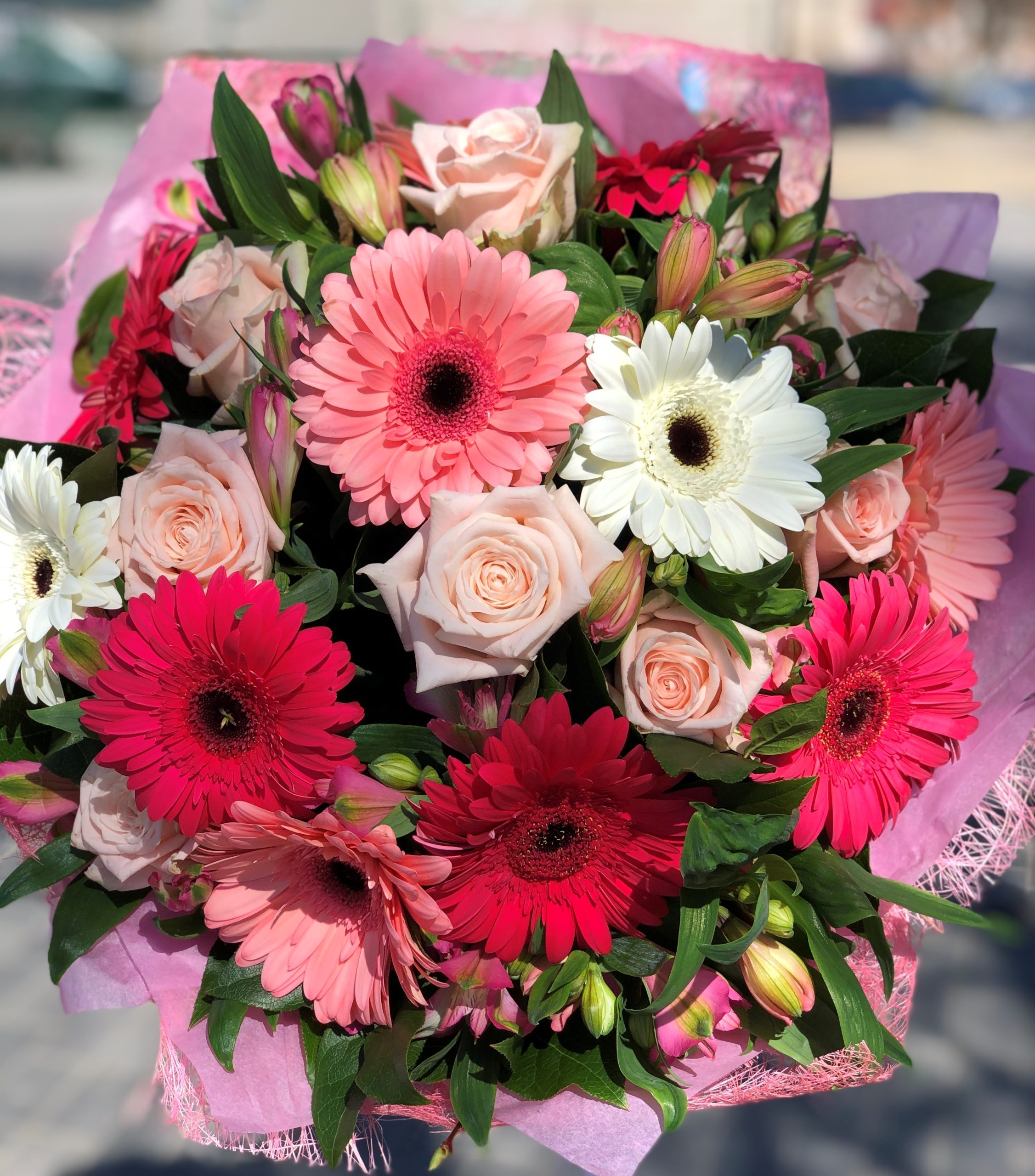 Букет подарочный “Яркое признание”.Состав: гербера 11шт., альстромерия 9шт., роза одноголовая 9шт., зелень, подарочная упаковка, атласная лента. Цветовая гамма может быть изменена по желанию заказчика. Производство РБ. Наличие уточняйте у менеджера.