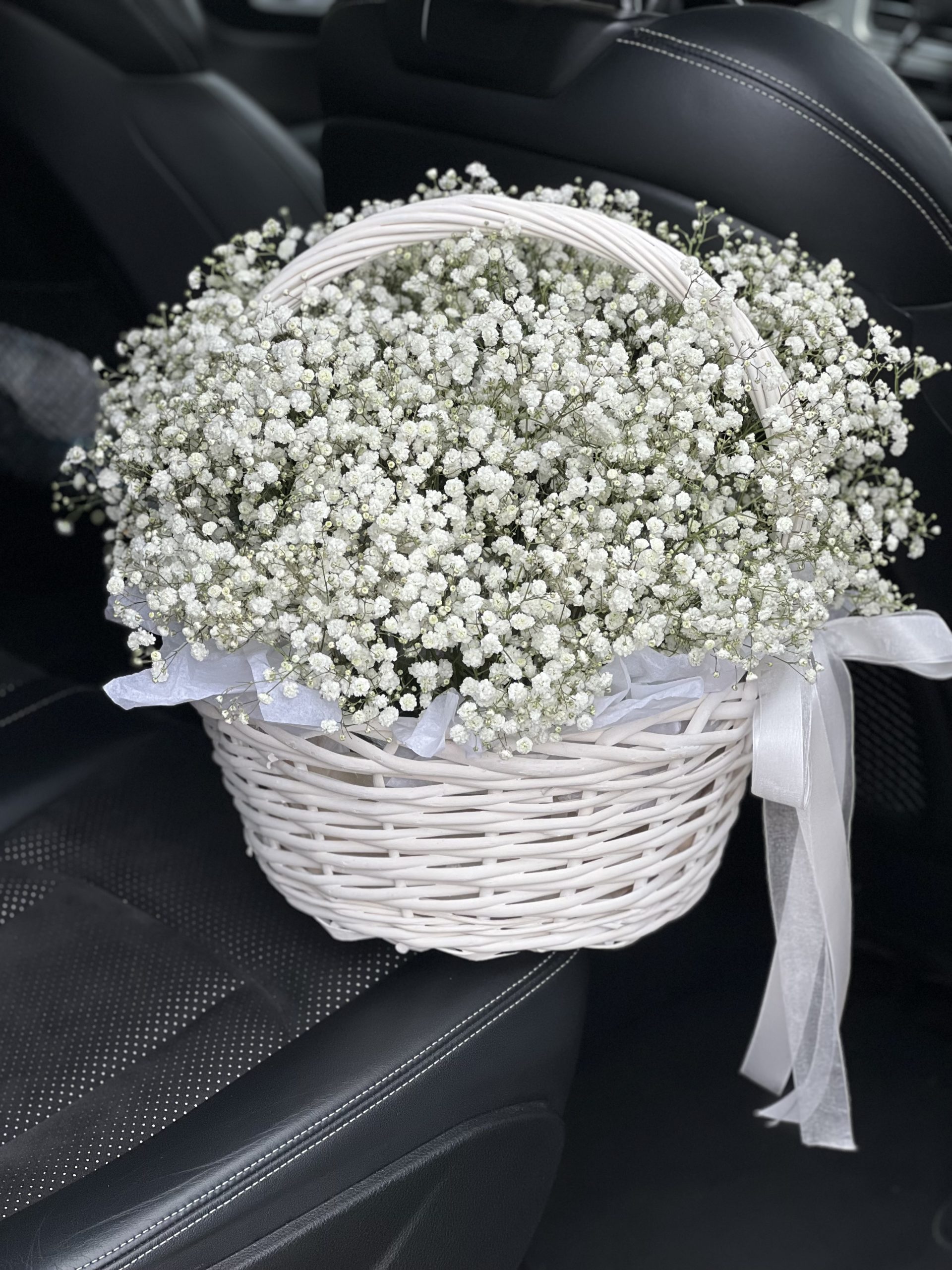 Композиция подарочная в корзинке “Белоснежка”. Состав: гипсофила, губка флористическая, корзинка декоративная. Цветовая гамма может быть изменена по желанию заказчика. Наличие уточняйте у менеджера. Производство РБ. Композиция доступна по предзаказу.