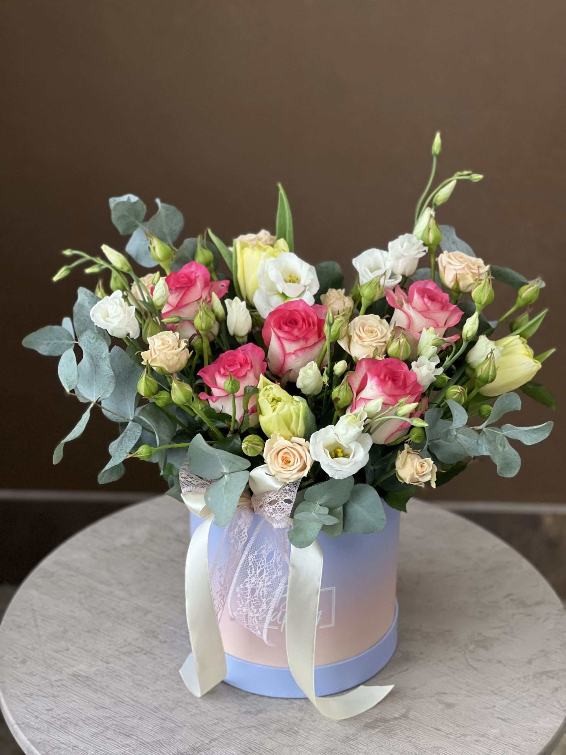 Композиция подарочная в коробке “Градиент”. Состав: одноголовая роза, эустома, кустовая роза, тюльпаны, зелень, губка флористическая, коробка декоративная. Цветовая гамма может быть изменена по желанию заказчика. Наличие уточняйте у менеджера. Производство РБ. Композиция доступна по предзаказу.
