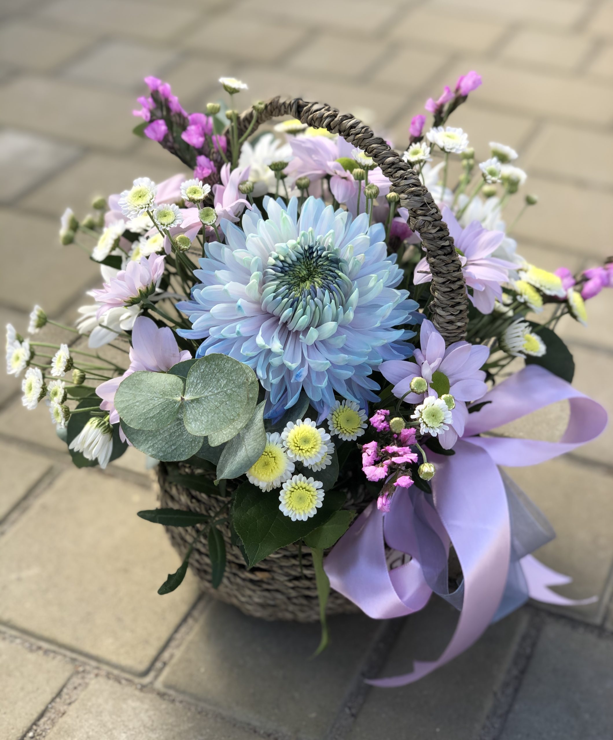 Композиция в корзинке “Маленькое лето”. Состав: Хризантема одноголовая, хризантема кустовая, статица, зелень, губка флористическая, корзинка декоративная, атласная лента. Цветовая гамма может быть изменена по желанию заказчика. Производство РБ.Наличие уточняйте у менеджера.
