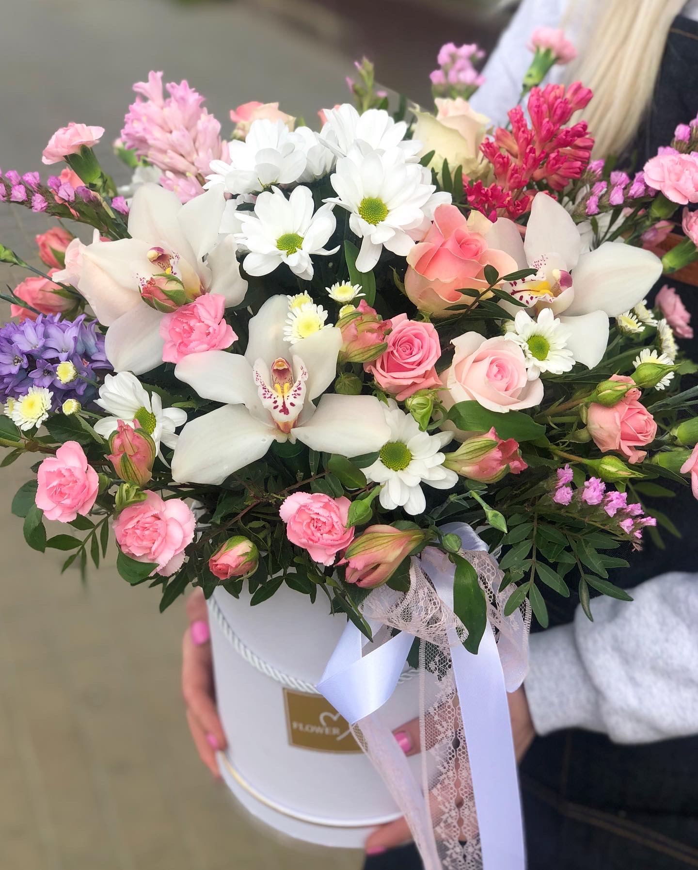 Композиция подарочная в коробке “Очарование”. Состав: орхидея цимбидиум, кустовая роза, одноголовая роза, альстромерия, гиацинты, гвоздика кустовая,  хризантема кустовая, статица, зелень, губка флористическая, коробка декоративная, атласная лента. Наличие уточняйте у менеджера. Производство РБ,