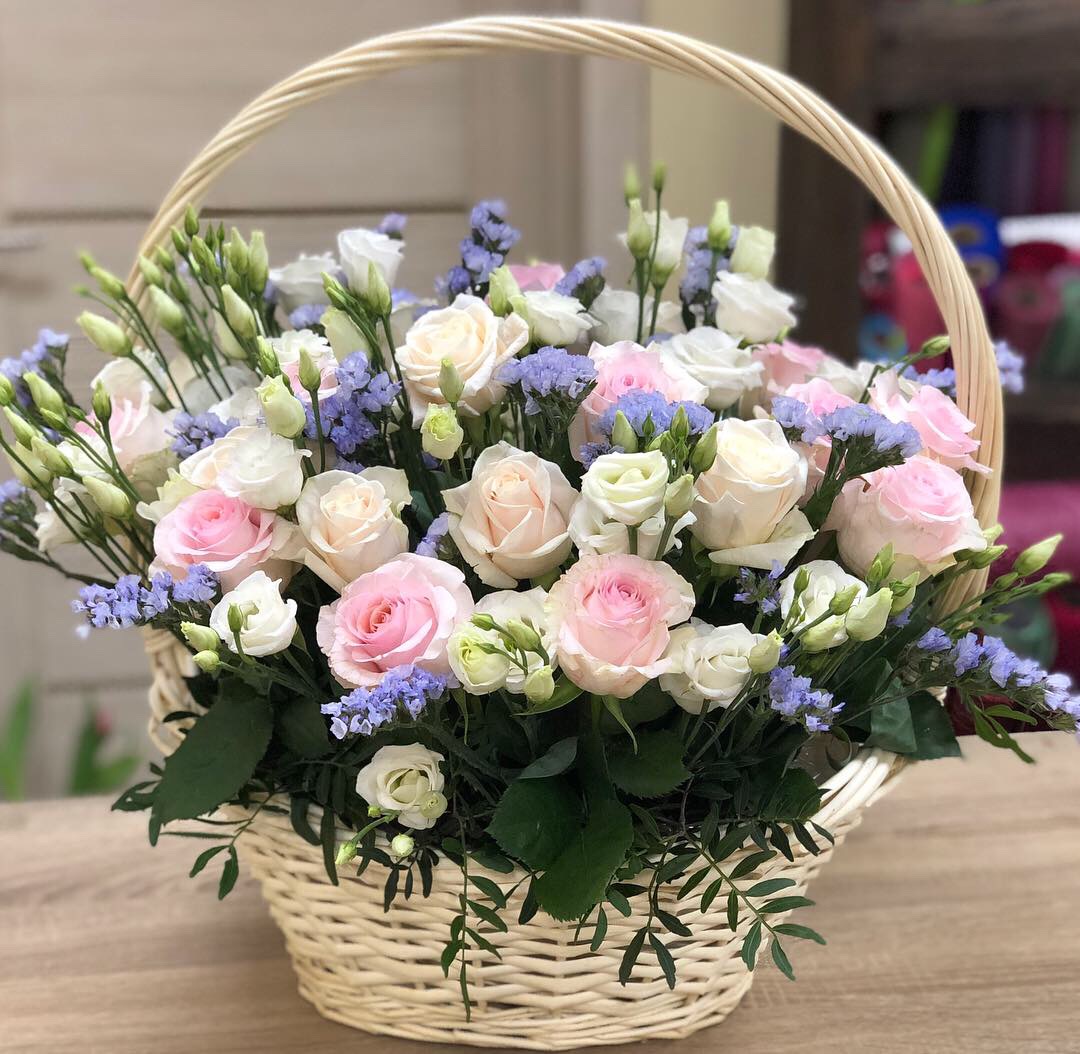 Композиция в корзине “Очарование”. Состав: роза одноголовая, эустома, статица, зелень,губка флористическая, целлофан, атласная лента,корзина декоративная. Цветовая гамма может быть изменена по желанию заказчика. Производство РБ. Наличие уточняйте у менеджера.