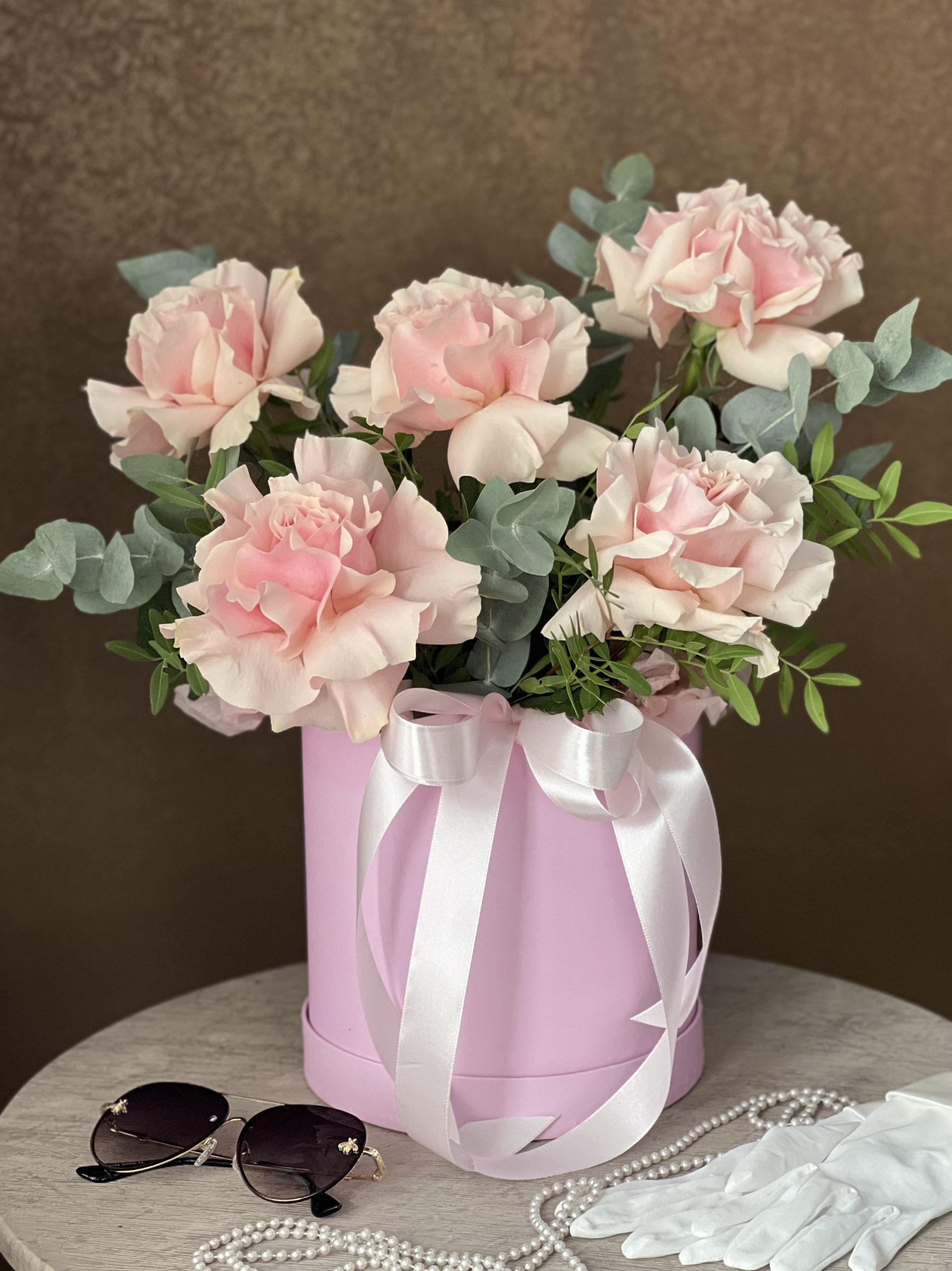 Композиция подарочная в коробке “Парижанка”. Состав: французская роза, зелень, атласная лента, губка флористическая, подарочная коробка. Цветовая гамма может быть изменена по желанию заказчика. Наличие уточняйте у менеджера. Производство РБ.