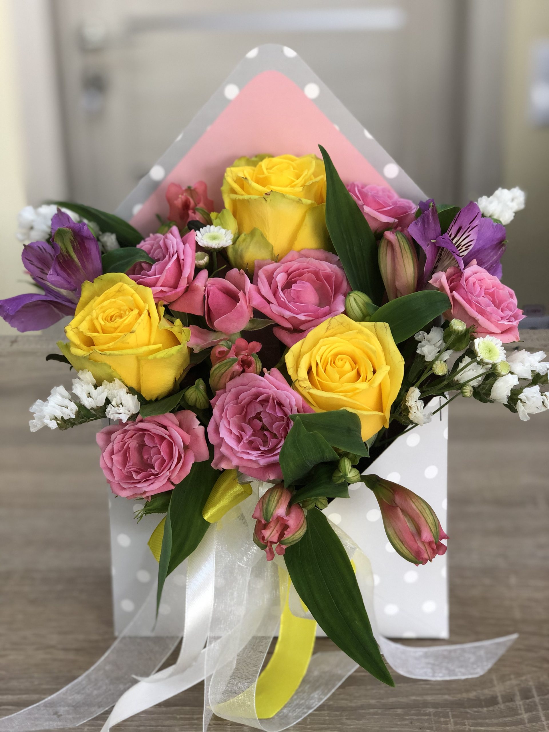 Композиция “Письмо из роз”. Небольшая цветочная композиция в подарочном конверте как прекрасное дополнение к подарку. Состав: одноголовая роза, кустовая роза, кустовая хризантема, зелень, подарочная коробка-конверт, губка флористическая, целлофан, атласная лента. Цвет может быть подобран на вкус покупателя. Наличие уточняйте у менеджера. Производитель РБ.