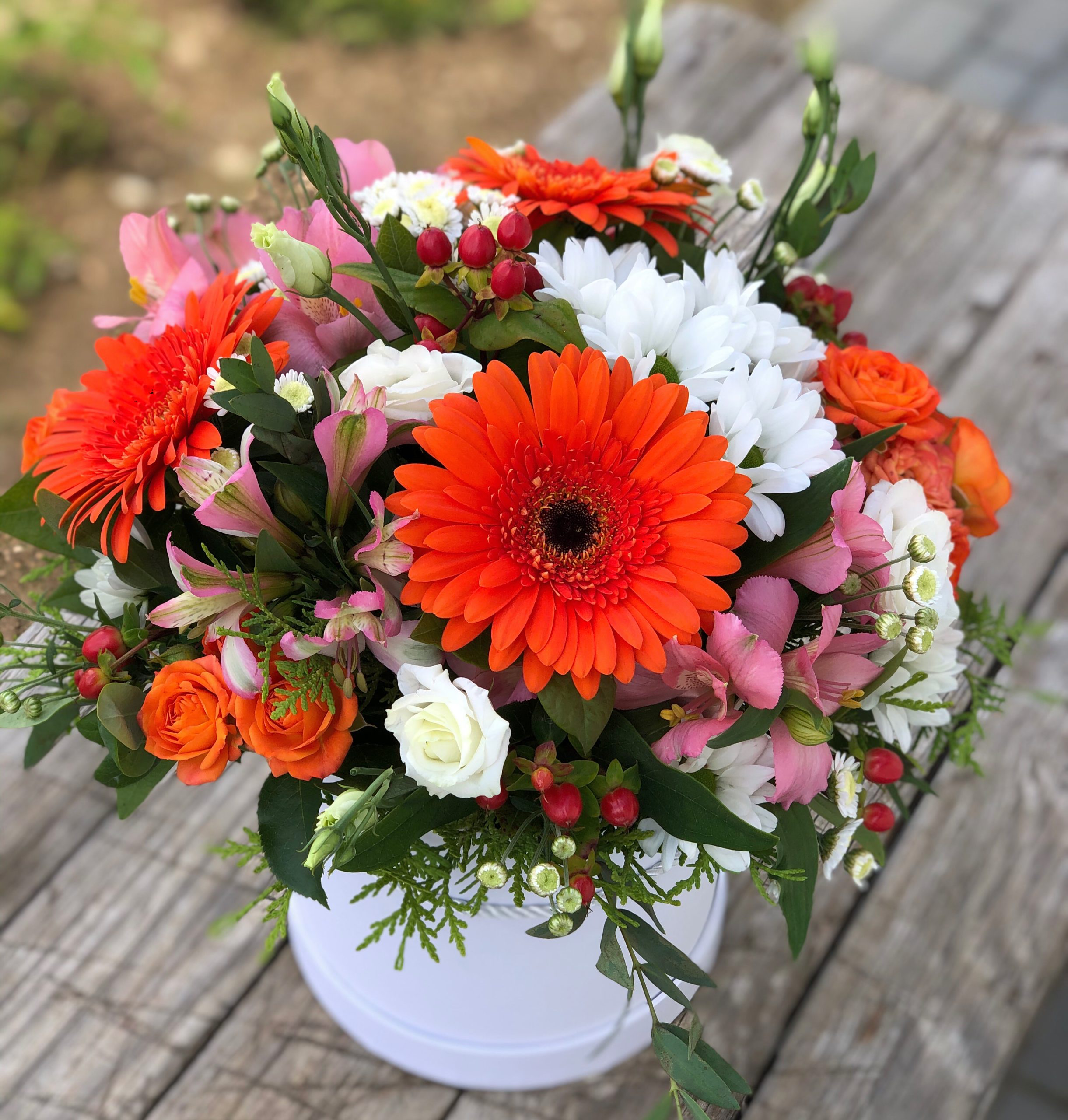 Композиция “Пылкие чувства”. Состав: гербера, альстромерия, хризантема, гиперикум, кустовая роза, эустома, зелень, губка флористическая, коробка декоративная. Цветовая гамма может быть изменена по желанию заказчика. Производство РБ. Наличие уточняйте у менеджера.