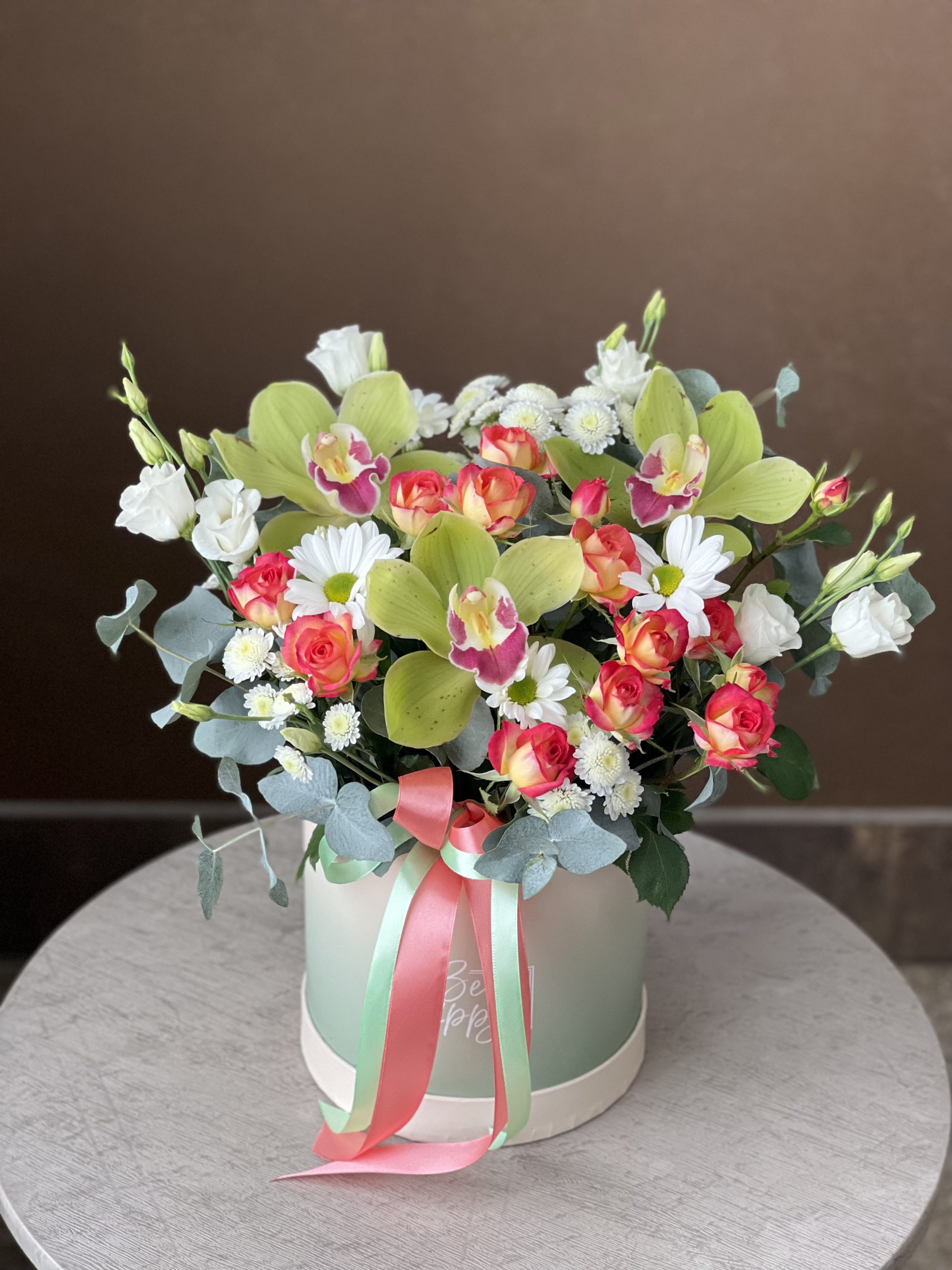 Композиция подарочная в коробке “Радостное событие”. Состав: орхидея цимбидиум, эустома, кустовая роза, кустовая хризантема, зелень, губка флористическая, коробка декоративная. Цветовая гамма может быть изменена по желанию заказчика. Наличие уточняйте у менеджера. Производство РБ. Композиция доступна по предзаказу.
