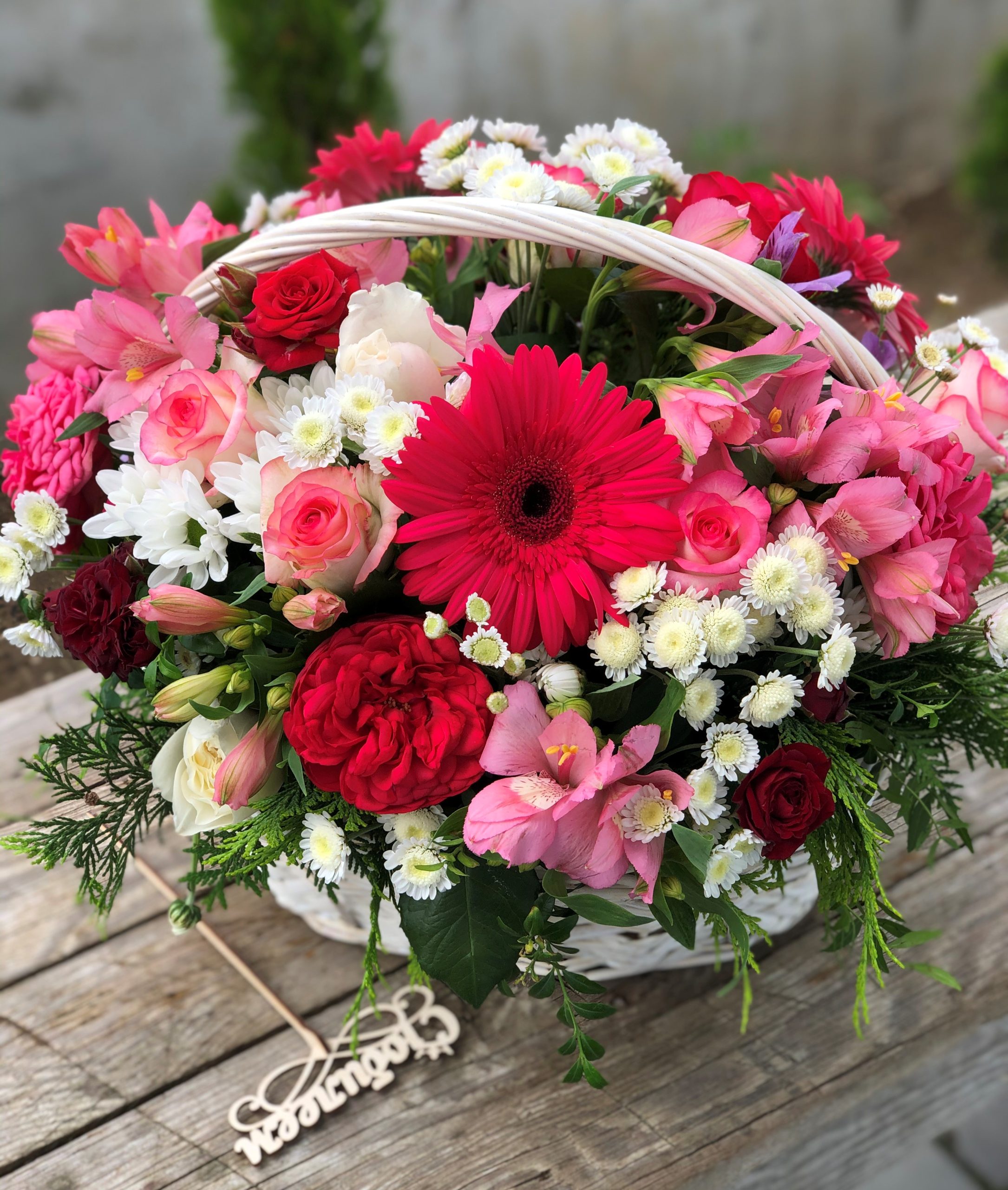 Композиция в корзинке “С днём варенья”. Состав: гербера, одноголовая роза, кустовая роза, альстромерия, хризантема, зелень, губка флористическая, корзинка декоративная. Цветовая гамма может быть изменена по желанию заказчика. Производство РБ. Наличие уточняйте у менеджера.