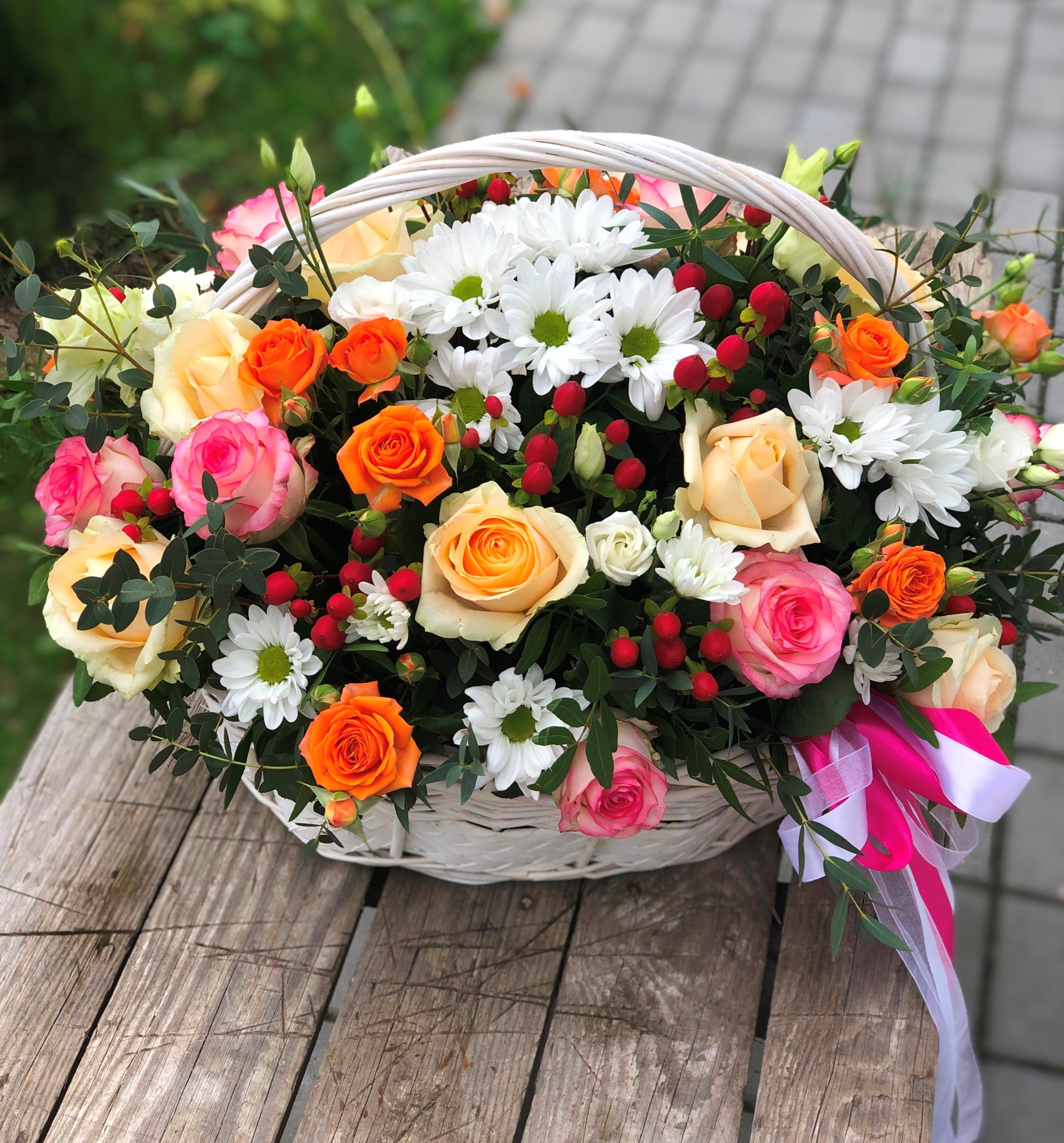 Композиция подарочная в корзинке “Сочные краски”. Состав: роза одноголовая, роза кустовая, хризантема кустовая, гиперикум, зелень, упаковка подарочная, губка флористическая, корзина декоративная. Цветовая гамма может быть изменена по желанию заказчика. Наличие уточняйте у мененджера. Производство РБ.