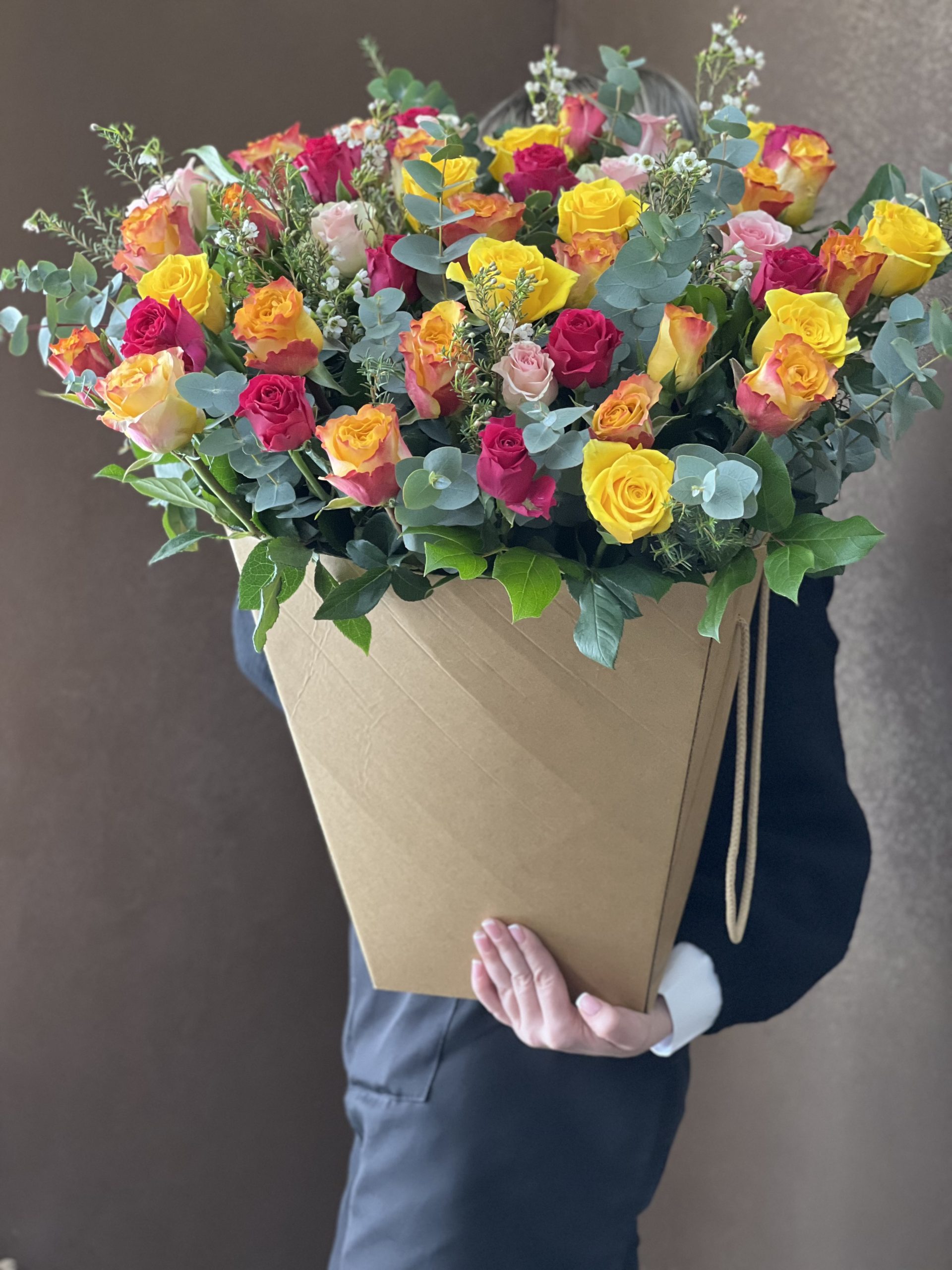 Композиция в коробке подарочная “Молочный шоколад”. Состав: роза одноголовая 55шт., лимонеум, хамелациум, зелень декоративная, коробка подарочная, губка флористическая, целлофан. Цветовая гамма может быть изменена по желанию заказчика. Производство РБ. Наличие уточняйте у менеджера.